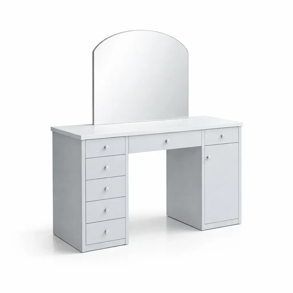 Cette coiffeuse est fabriquée en MDF avec une finition lisse. Elle inclut un miroir arquée.
